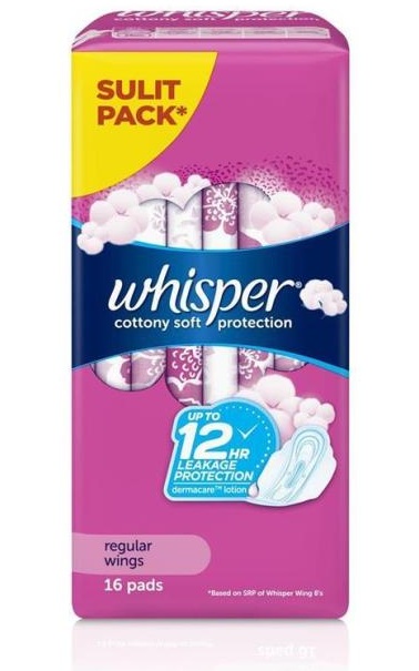 The Whisper Regular Flow Cottony with Wings 16’s is a sanitary pad designed for comfort and reliable protection during regular menstrual flow.  It features a soft, cottony cover that feels gentle on the skin and includes Dermacare lotion to help prevent rashes and irritation, making it ideal for sensitive skin.  The wings ensure a secure fit by adhering to the sides of underwear, reducing the risk of shifting or leaks.
